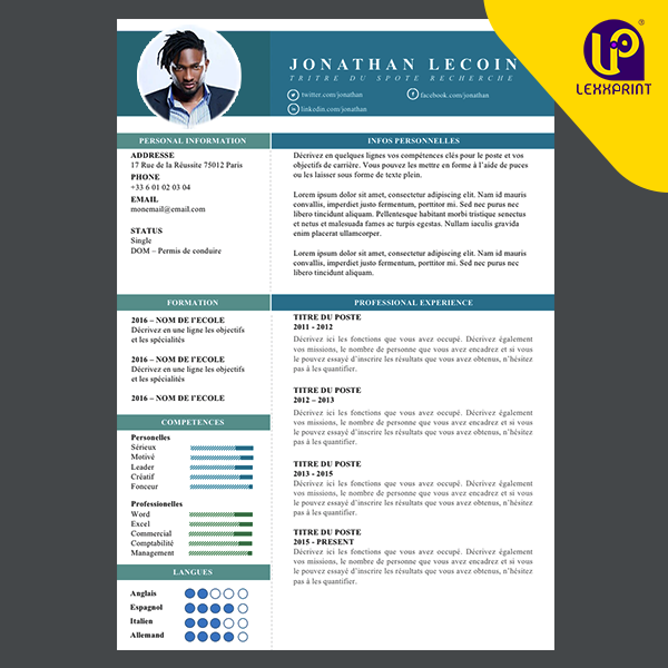 NB : Vous pouvez personnaliser votre CV LEXXPRINT selon vos préférences de couleurs.